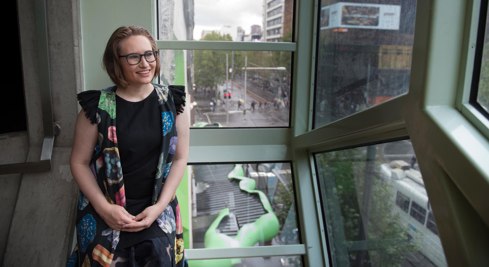 Jess Junor (pictured at Storey Hall, City Campus) studied in France with the support of the John Storey Junior Memorial Scholarship
